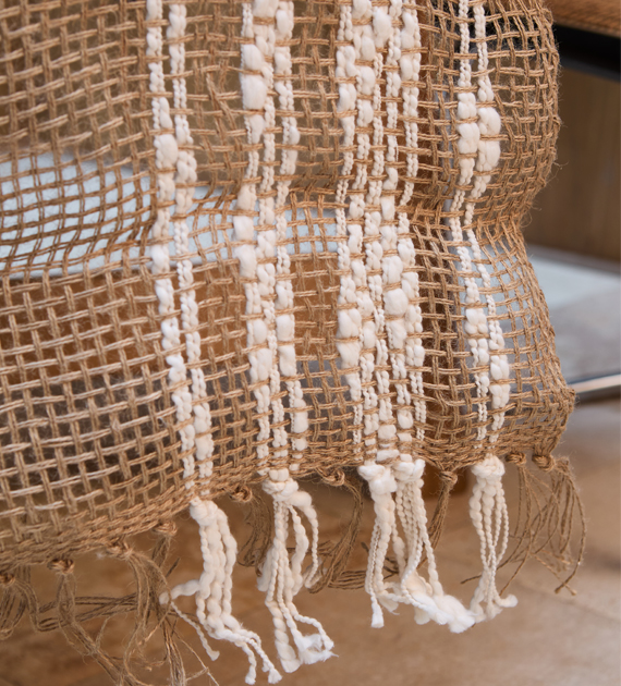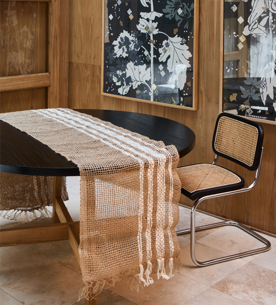 Jute table runners combine the rustic, natural texture of the fiber with slub cotton details, which add visual softness and a subtle contrast.