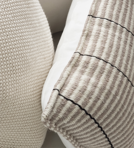 Los almohadones de la colección Valle están tejidos con lana, y se caracterizan por sus diseños de rayas, cruces y motivos geométricos, que aportan carácter y una identidad marcada al ambiente.