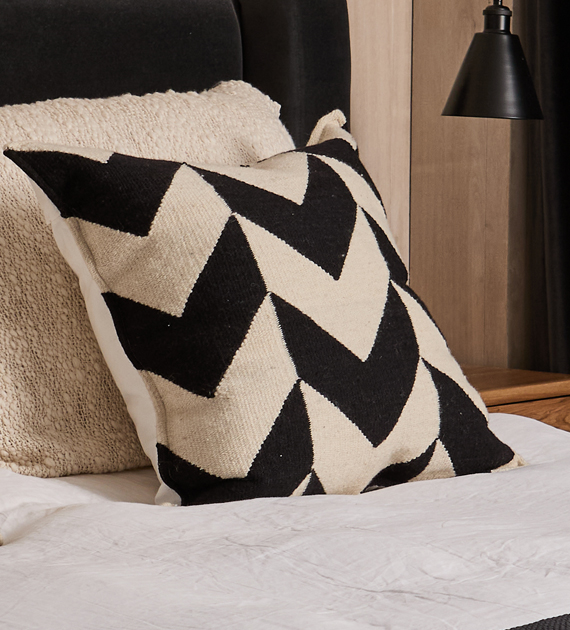 Los almohadones de la colección Valle están tejidos con lana, y se caracterizan por sus diseños de rayas, cruces y motivos geométricos, que aportan carácter y una identidad marcada al ambiente.