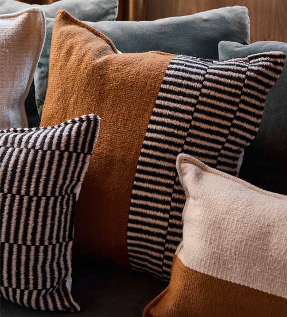 Los almohadones de la colección Valle están tejidos con lana, y se caracterizan por sus diseños de rayas, cruces y motivos geométricos, que aportan carácter y una identidad marcada al ambiente.
