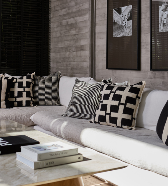 Los almohadones de la colección Valle están tejidos con lana, y se caracterizan por sus diseños de rayas, cruces y motivos geométricos, que aportan carácter y una identidad marcada al ambiente.