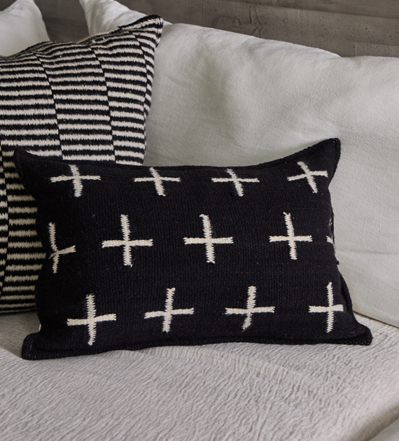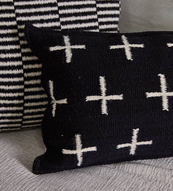 Los almohadones de la colección Valle están tejidos con lana, y se caracterizan por sus diseños de rayas, cruces y motivos geométricos, que aportan carácter y una identidad marcada al ambiente.