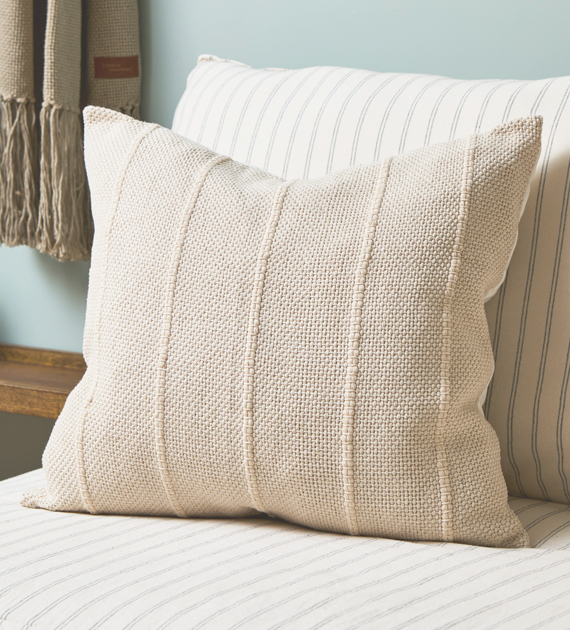 Almohadón cuadrado tejido en telar de peine con algodón puro, en tono natural. Los canelones también en tono natural aportan textura y relieve, sumando interés visual sin perder neutralidad. Una pieza equilibrada que transmite frescura y armonía, fácil de combinar en distintos ambientes.