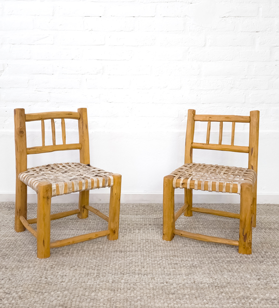 Set x 2 sillas materas realizadas en madera de chañar recuperada de podas, con asiento de tiento tejido a mano. Cada pieza se elabora bajo un proceso totalmente hecho a mano, respetando los tiempos y técnicas tradicionales.