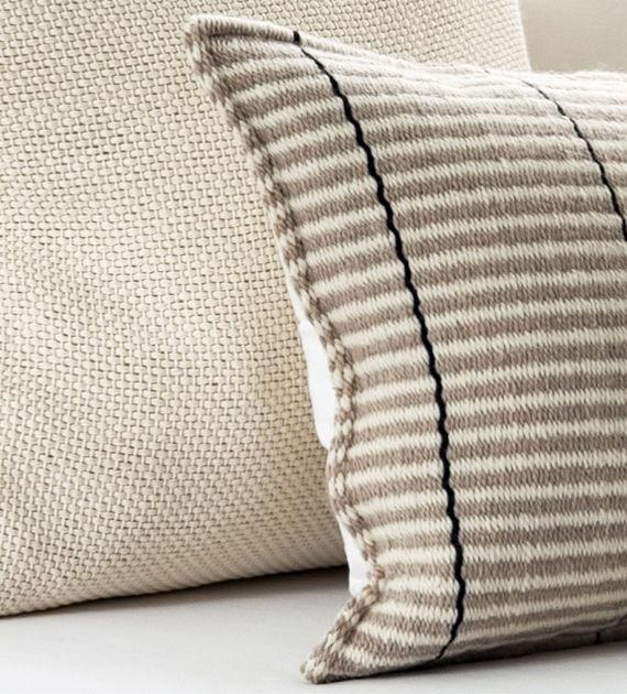 Los almohadones de la colección Valle están tejidos con lana, y se caracterizan por sus diseños de rayas, cruces y motivos geométricos, que aportan carácter y una identidad marcada al ambiente.