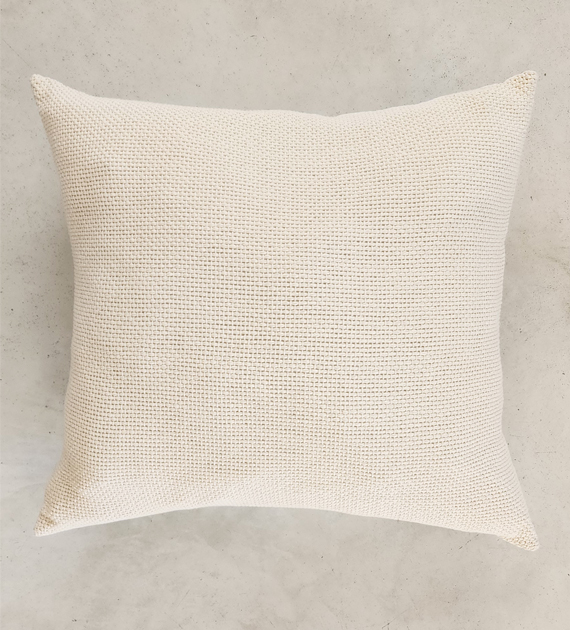 Almohadón cuadrado tejido en telar de peine con algodón puro. Contratapa en tusor 100% algodón color tiza.