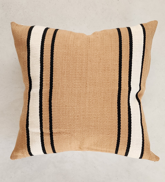 Almohadón cuadrado tejido en telar criollo con lana pura de oveja hilada a mano. Contratapa en tusor 100% algodón color tiza.