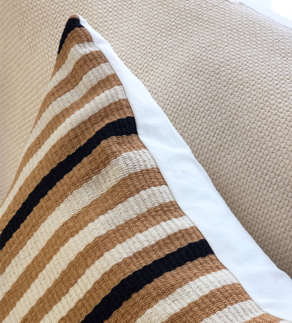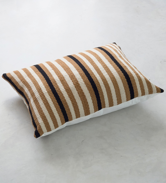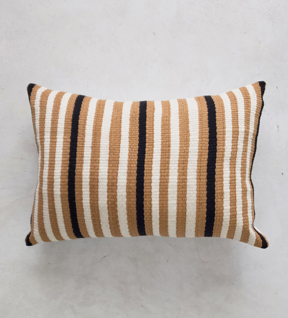 Almohadón rectangular tejido en telar criollo con lana pura de oveja hilada a mano. La colección Hornillos se caracterizan por su diseño a rayas delicadas, que aporta ritmo y sutileza visual sin sobrecargar el ambiente.
