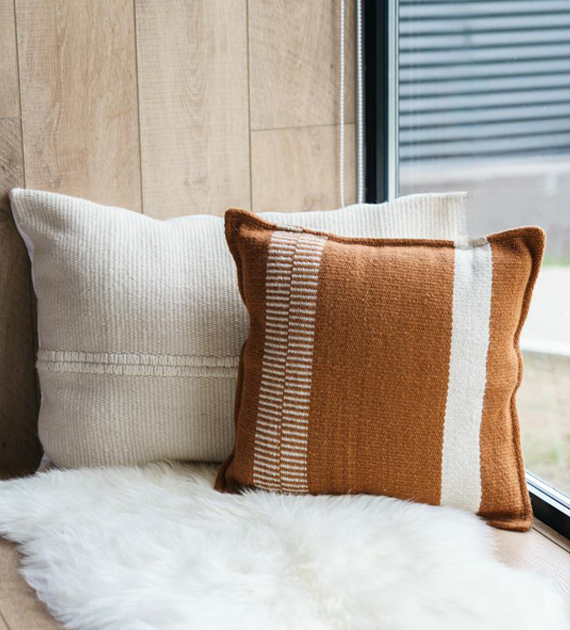 Los almohadones de la colección Valle están tejidos con lana, y se caracterizan por sus diseños de rayas, cruces y motivos geométricos, que aportan carácter y una identidad marcada al ambiente.