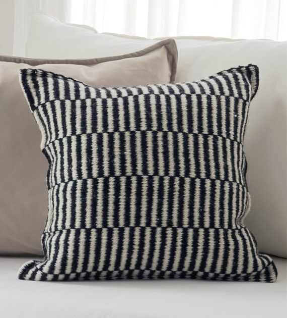 Los almohadones de la colección Valle están tejidos con lana, y se caracterizan por sus diseños de rayas, cruces y motivos geométricos, que aportan carácter y una identidad marcada al ambiente.