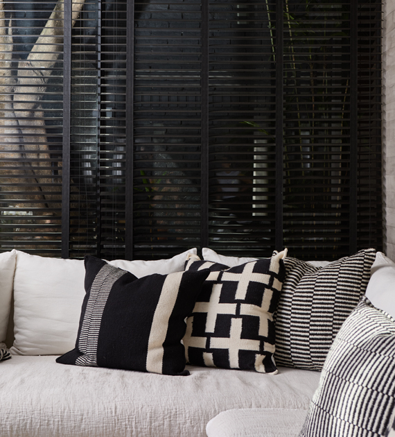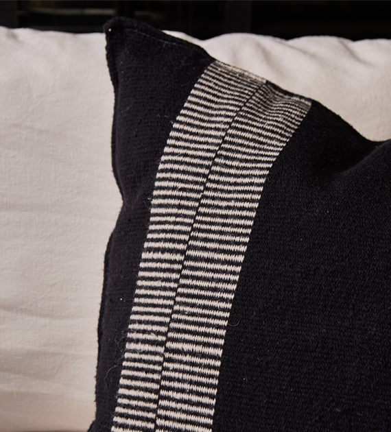 Los almohadones de la colección Valle están tejidos con lana, y se caracterizan por sus diseños de rayas, cruces y motivos geométricos, que aportan carácter y una identidad marcada al ambiente.
